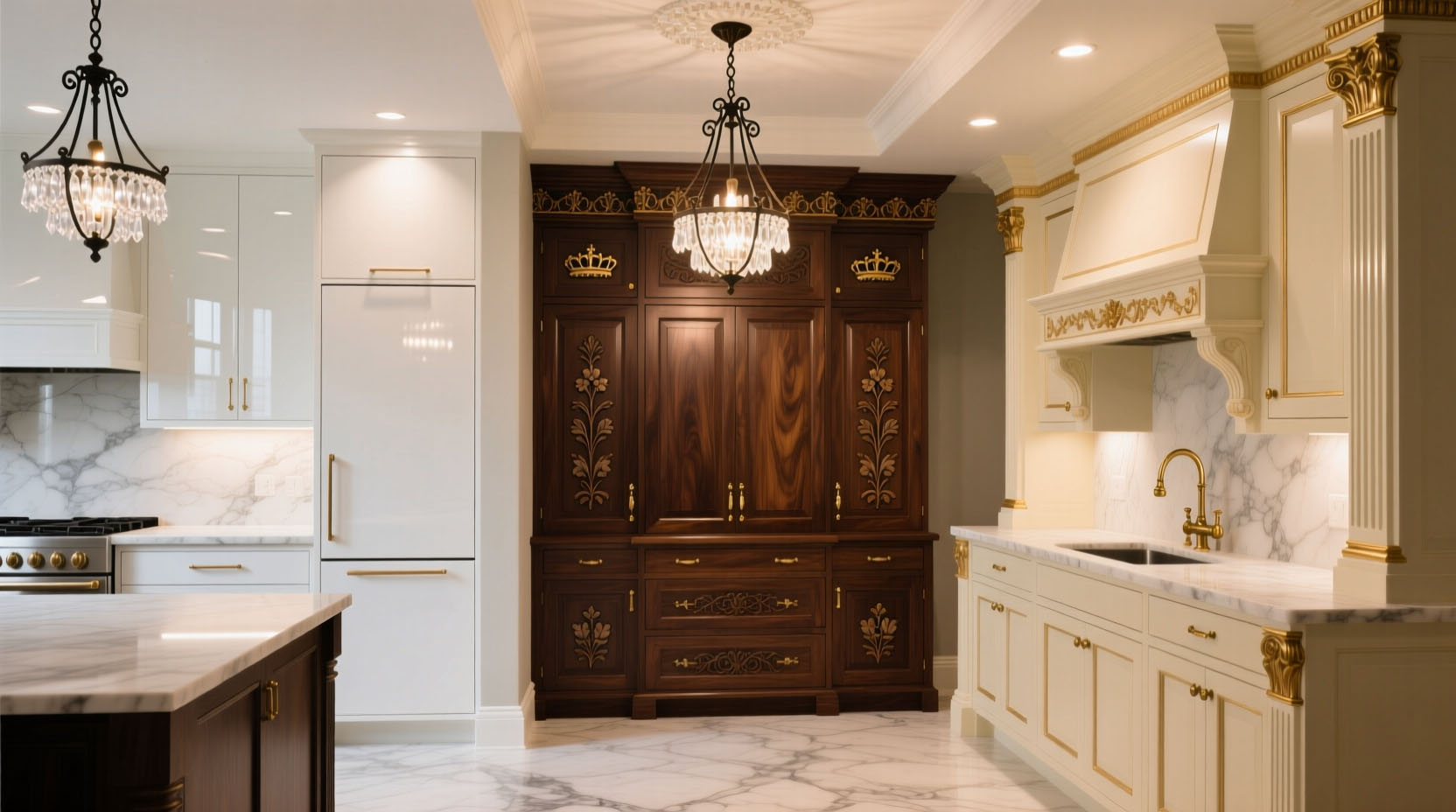 در نقطهی مقابل سادگی مدرن، کابینتهای کلاسیک با جزئیات پرکار، منبتکاری، قابهای برجسته و تاجهای تزئینی شناخته میشوند. این سبک، بازتابی از معماری اروپایی و فضای اشرافی خانههای قدیمی است؛ جایی که چوب طبیعی، رنگهای گرم و نقشونگارهای ظریف بر ظواهر فضا سلطه داشتند.